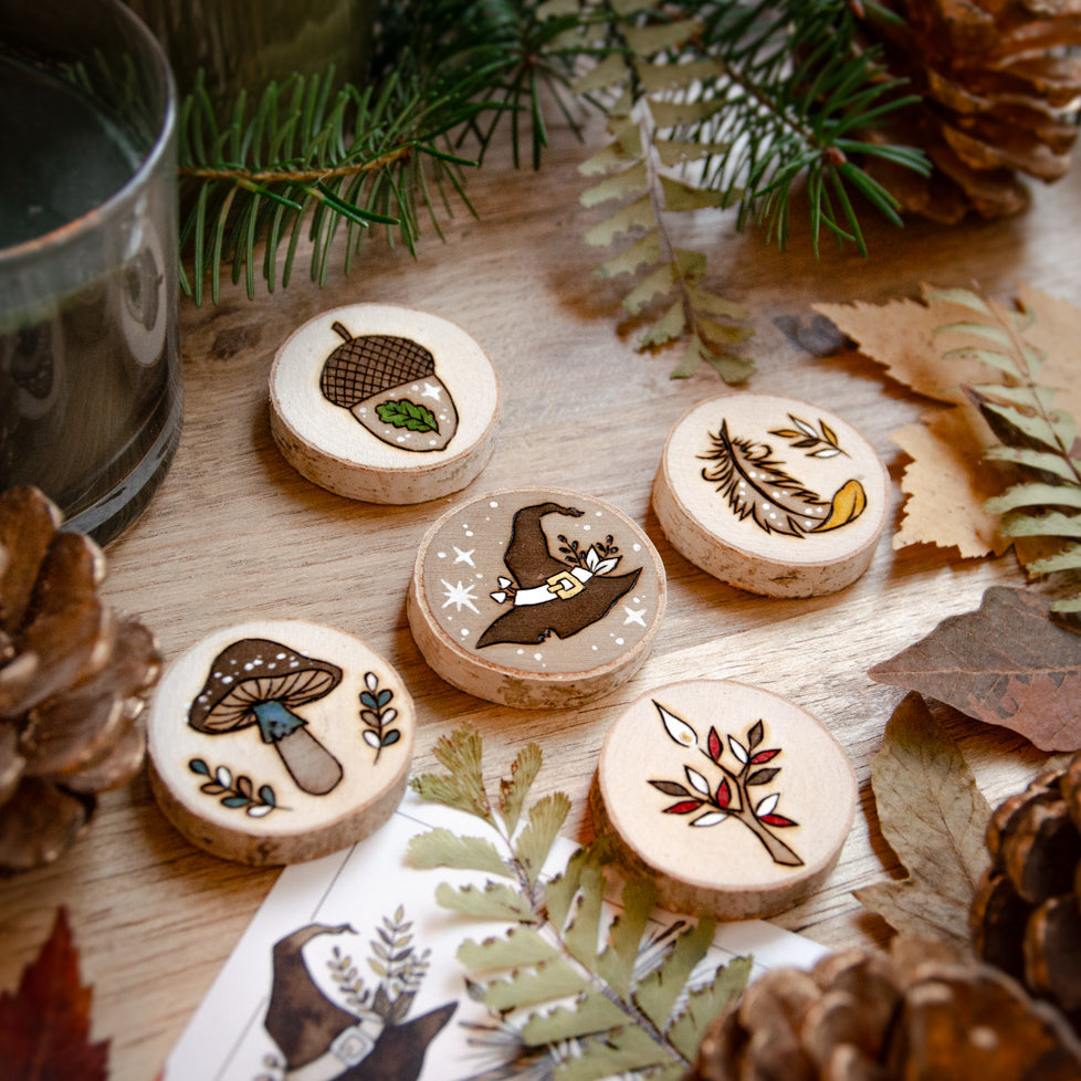 - Diameter: 1 ½" / 4 cm (slight variations are natural). Randomly selected from the five suit-aligned designs: Acorn, Feather, Branch, Mushroom, or the elusive Witch's Hat.